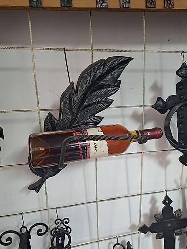 - Zidni držač za jednu bocu – dekorativni list kao osnova, kovana traka sa uvijenim detaljem za čvrsto pridržavanje boce; pogodan za montažu na zid (rupa/šraf za kačenje).