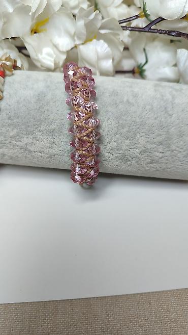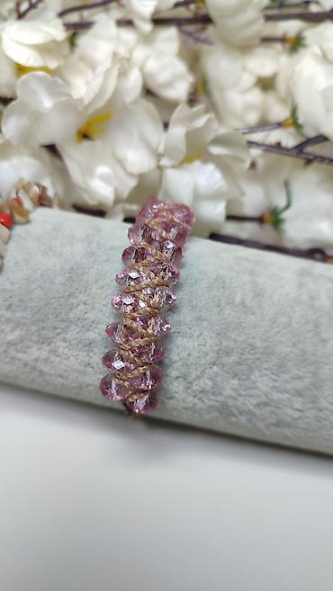- Materijal: facetirane staklene/kristalne perle u nežno roze boji, uparene sa čvrstim koncem u boji prirodnog lana
