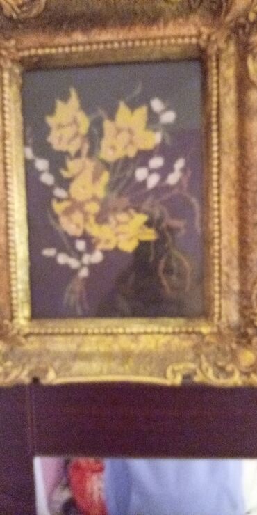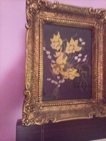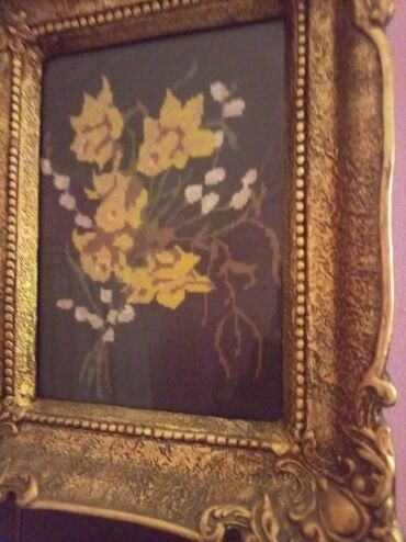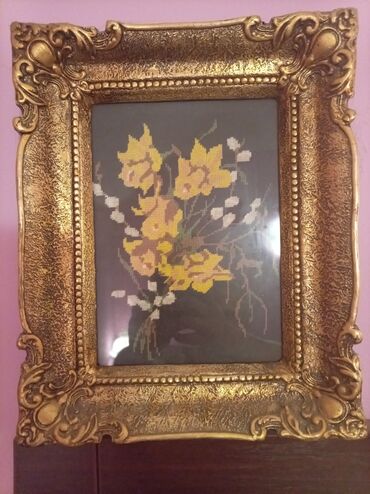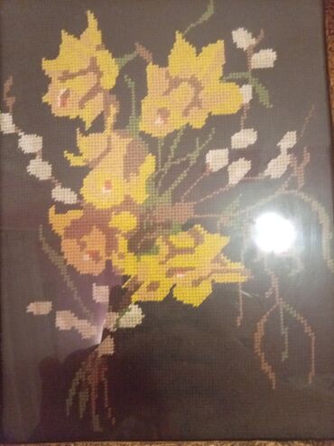 Ručni rad – goblen sa motivom žutih cvetova - Tehnika: klasični goblen/krst vez na tamnoj podlozi - Motiv: buket žutih cvetova sa belim pupoljcima i grančicama - Uokvireno: dekorativan, bogato orn...Dogovor