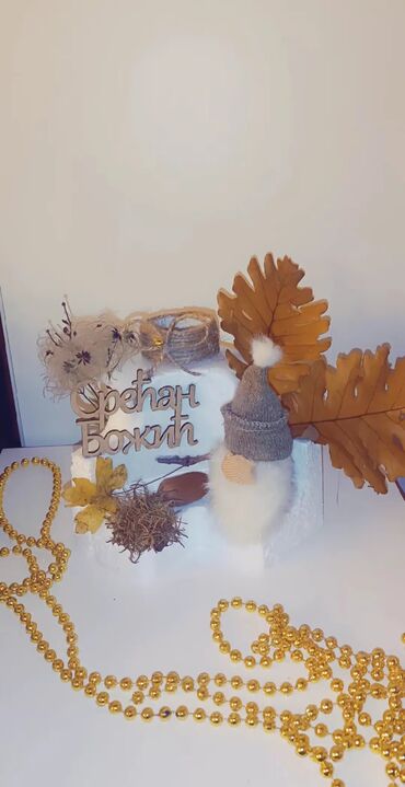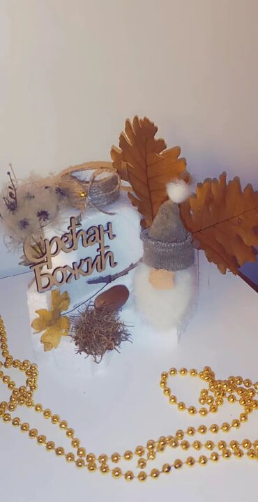 - Prirodni detalji: suvo lišće hrasta, žir, grančice, mahovina/gnezdašce, ukrasne cvetne perlice i rustični kanap sa zlatnom perlicom.