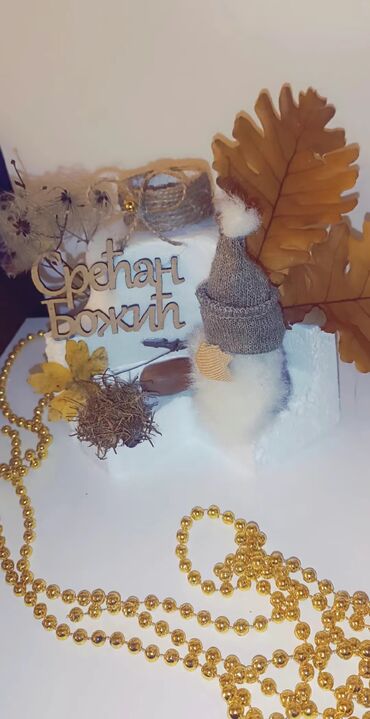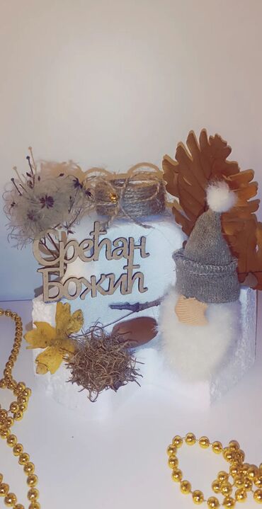 - Tematski aranžman na beloj postolji od stiropora sa natpisom „Srećan Božić” (laserski isečen/reljefni drveni natpis).