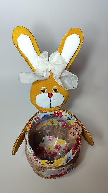 - Dekorativna korpica sa figurom zeke (žuta glava i uši sa belom mašnom).