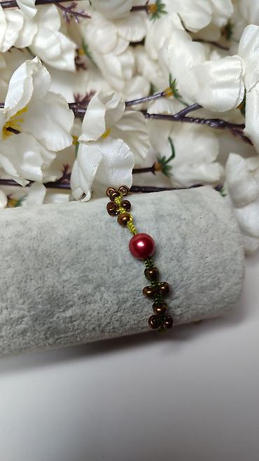 - Ukrasne perle: niz sitnih metalik perlica u bronzanoj nijansi raspoređenih simetrično duž narukvice