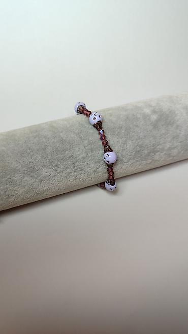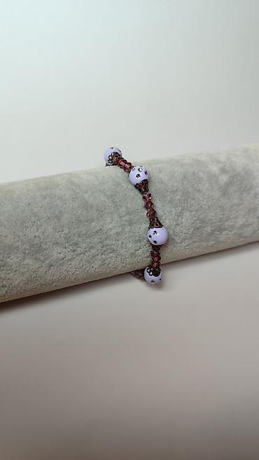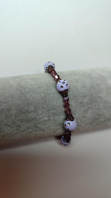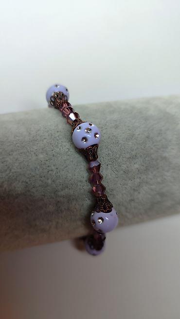 - Dizajn: kombinacija okruglih, svetloljubičastih perli ukrašenih sitnim sjajnim kamenčićima i fasetiranih staklenih kristala u tonovima roze/šljive.
