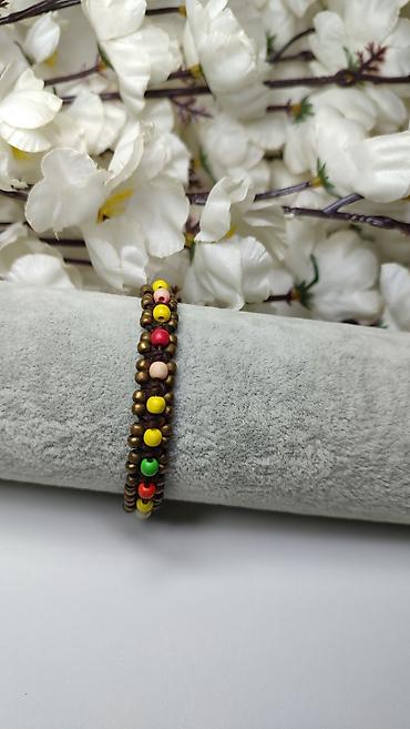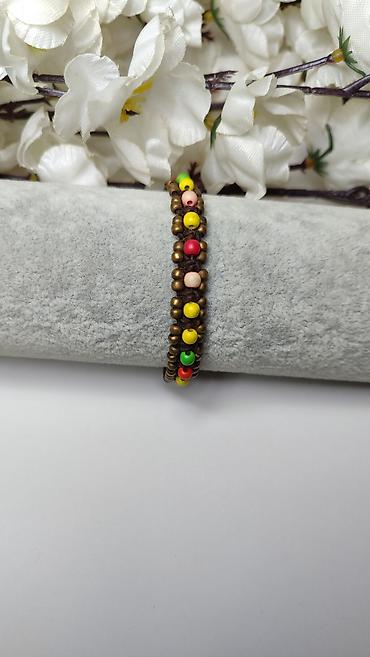 - Dizajn: pleteni dupli red sitnih bronzanih perli sa centralnim nizom šarenih akcentnih perlica (žuta, crvena, zelena, ružičasta), raspoređenih u ritmičnom nizu.