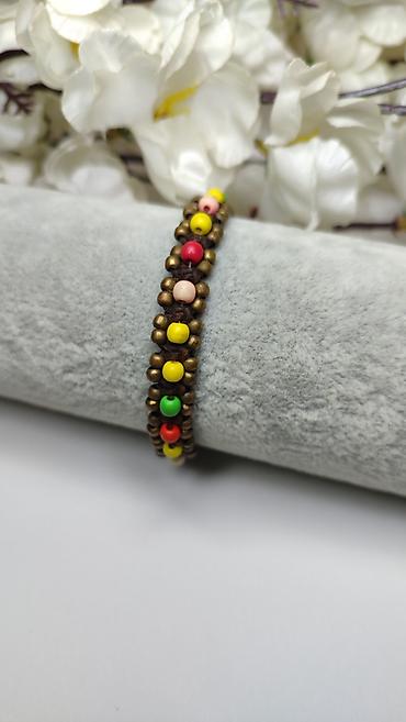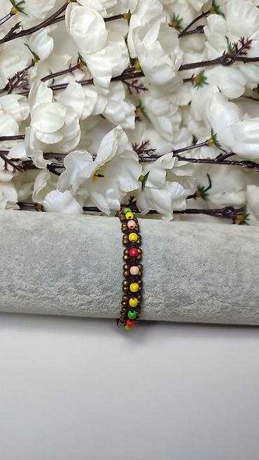 - Dizajn: pleteni smeđi konac sa centralnim nizom sitnih šarenih perli (žuta, crvena, zelena, bež), uokvirenih sitnim metalnim perlama u bronzanoj nijansi.