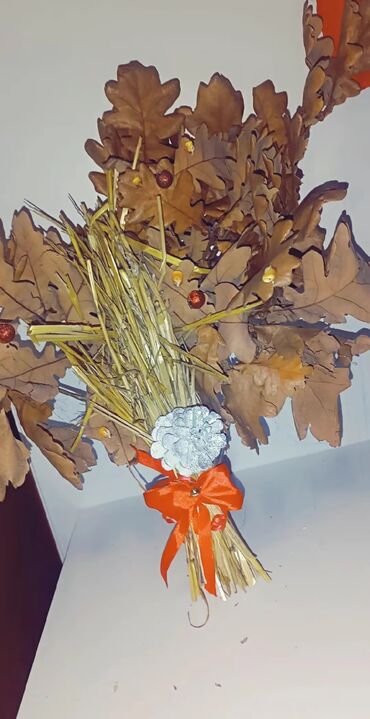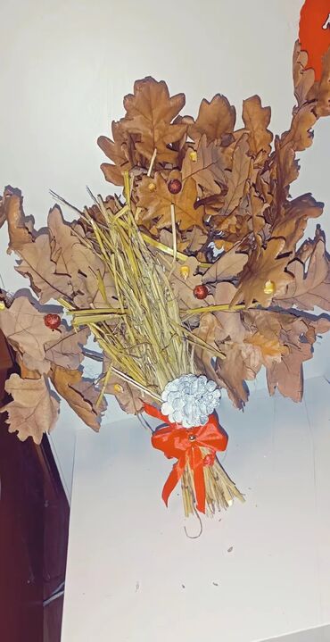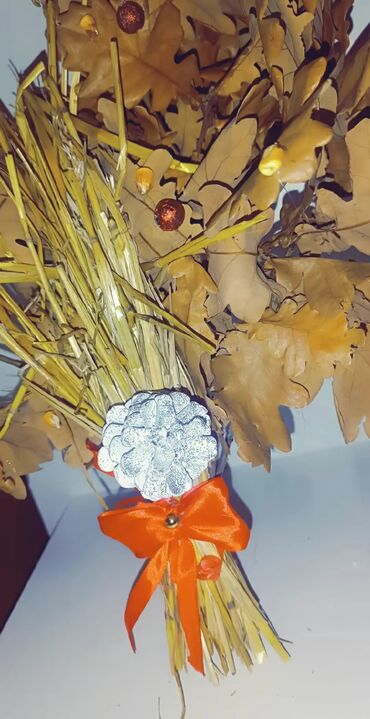 Ručni buket od suvih hrastovih grana sa klasjem/slamom, dekorisan crvenom satenskom mašnom. - Bogata krošnja hrastovih listova raspoređena u obliku lepeze. - Centralni deo od prirodne slame/klasj...