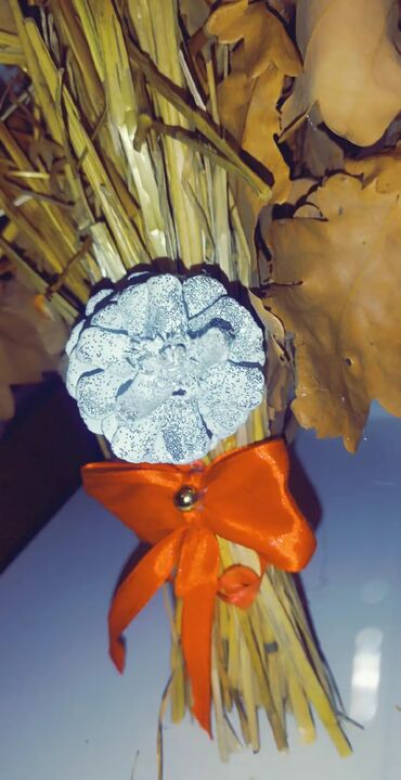 Ručni božićni aranžman – badnjak buket - Tradicionalni buket od suvog hrastovog lišća (badnjak grančice) i slame - Dekorisan šišarkama (jedna prirodna, jedna oslikana belo-srebrno), ukrasnim perla...