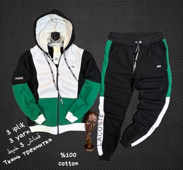 Muška trenerka brenda Lacoste, u crnoj boji, sa gornjim delom u kombinaciji zelene, bele i crne boje. Gornji deo trenerke ima kapuljaču i rajsferšlus po celoj dužini, kao i dva bočna džepa sa rajsf...