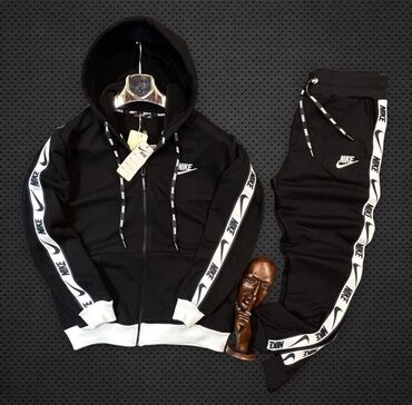 Muški komplet trenerki – dva modela 1) Nike komplet: - Gornji deo na rajsferšlus, visoka kragna - Boje: crna sa plavim ramenima i belim detaljima/linijama - Diskretni Nike Swoosh logotipi na jakni...