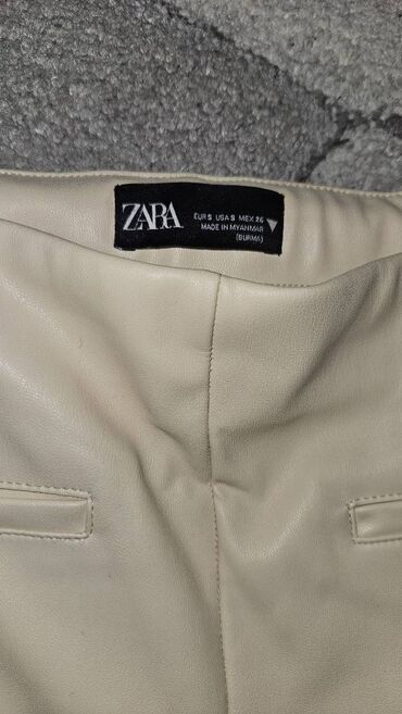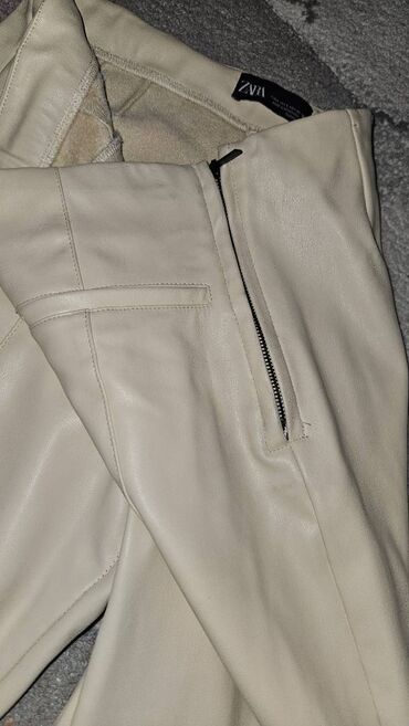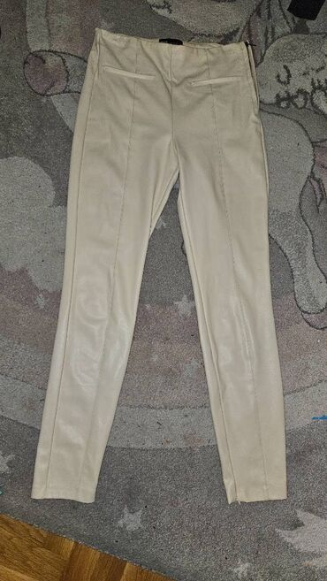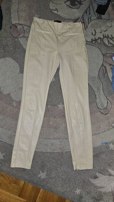 Bež ženske pantalone sa visokim strukom i pojasom na vez. Model sa blagim „paperbag“ strukom, elastičnom gumom i ukrasnom trakom napred. Širi, opušten kroj sa spuštenim preponama i ravnim nogavicam...