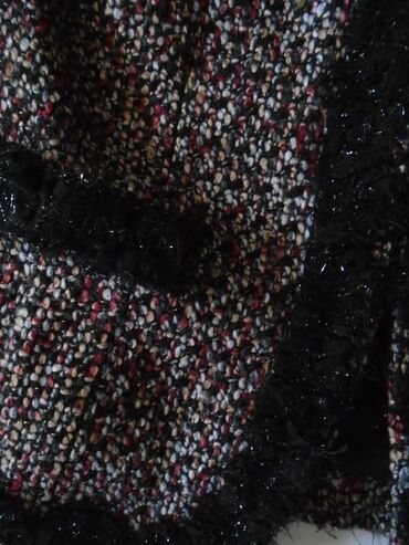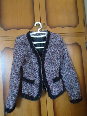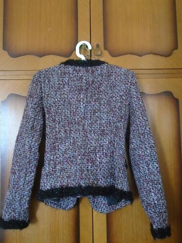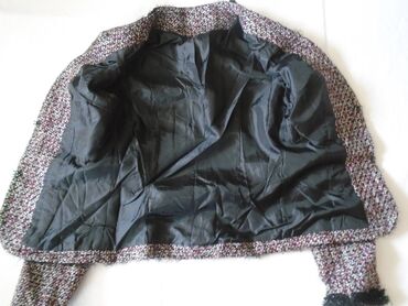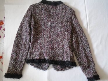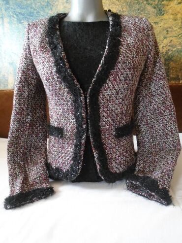 Divan sako inspirisan Chanel modelima, može da se kombinuje sa vise boja. Ide na haljinu, pantalone ili jeans. Veličina nije naznacena ali odgovara S velicini, sa poluobimom struka 36 cm. Pozadi je kraci a napred kao sto se vidi na slikama, duzi. Ima diskretno svetlucave detalje oko rubova i na mestu gde bi trebalo da budu dzepici.