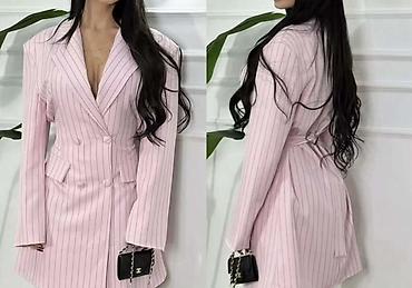 Elegantna mini haljina krojena u stilu sakoa, sa pinstripe prugama i duplim kopčanjem. Istaknuti reveri, strukirano krojenje koje prati liniju tela i blago izduženi rukavi. Dekorativni preklopni džepovi napred, diskretno preklapanje suknje. Dostupna u više boja prikazanih na fotografijama: crna, roze, plava i siva. Idealna za večernje izlaske, koktel prilike ili poslovno-šik kombinacije. Može se nositi samostalno ili uz čarape i štikle/čizme, a lepo se uklapa sa malim pismo-tašnama.
