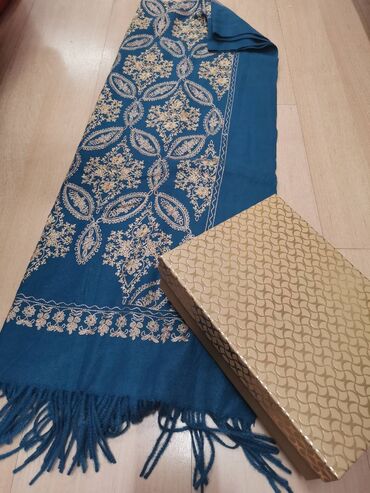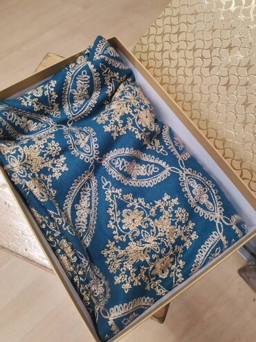 Ima vezene zlatkaste detalje, veoma lep i efektan. U ponudi je vise boja (plavo/tirkiz, crveni, sivi, puder roze, bez/camel) i dobija se sa ukrasnom zlatnom kutijom.