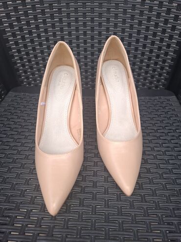 Elegantne salonke u zlatnoj boji - Model: klasične špic salonke - Veličina: 40 (označeno na đonu) - Boja/finish: metalik zlatna, blagi saten/shine efekat - Potpetica: tanka, približno 7–8 cm (proce...1 800 RSD