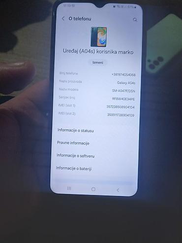 Napomena: Na fotografijama su prikazani ekran, bočni profil, poleđina sa tri kamere i stranica „O telefonu“ sa nazivom proizvoda Galaxy A04s i modelom SM‑A047F/DSN.