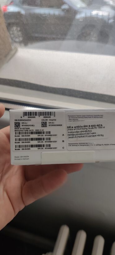 Sadržaj kutije prema oznakama na pakovanju: leve (L) i desne (R) slušalice model SM‑R400N sa pripadajućim serijskim brojevima; kućište za punjenje (navedeno kroz trajanje baterije).