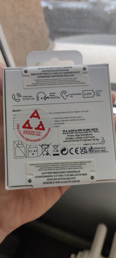 Napomena sa pakovanja: ne prihvatati ako je fabrička plomba oštećena. Ulazna snaga punjenja 2.1–4.5 W. Printano sojinom tintom. CE/UKCA oznake.