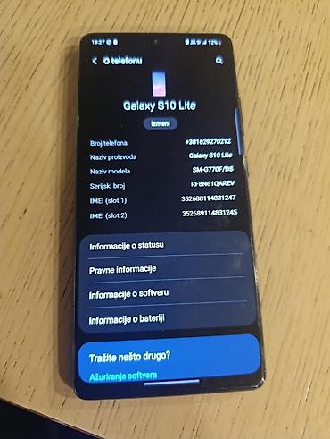 Telefon je tanak, sa USB‑C priključkom i rešetkom zvučnika na dnu, mikrofonom na vrhu i bočnim tasterima za jačinu/zasiljanje. Model i serijski podaci vidljivi u meniju “O telefonu”: Galaxy S10 Lite, model SM‑G770F/DS, dual‑SIM.