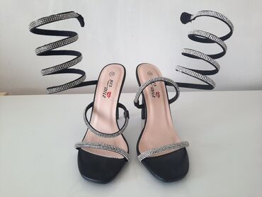 Ženske sandale sa visokom štiklom i otvorenim prstima. - Brend: Keanli (otisak na ulošku) - Materijal uloška: prava koža (oznaka “Vera Pelle”) - Dizajn: kombinacija zebra pruga (crno‑bele) i detal...