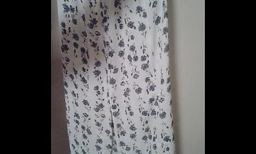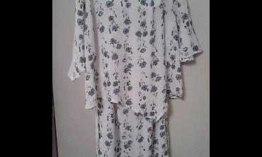 Elegantan lagan beli svileni komplet sa sarenim cveticima,nov,velicine L.Bluza na vezivanje,a suknja je duza sa dva slica sa strane.Moze se nositi i odvojeno i jedno i drugo,jako lepo stoji i prijatno je za nosenje.Sjajan je za poklon,leto ili kombinaciju uz nesto toplije zimi.