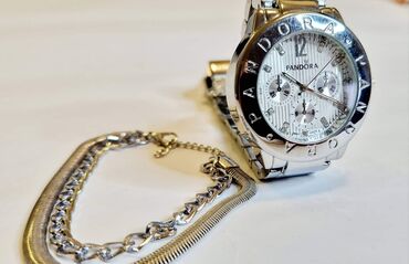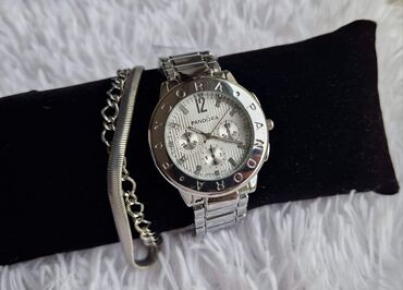 Komplet elegantnog nakita i ručnog sata – ženski set Sadržaj seta: - Ručni sat sa kvarcnim mehanizmom, okruglim kućištem, rimskim brojevima na belom ciferu i bogato ukrašenim narukvicama sa krista...