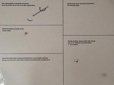 - Uputstva za bezbedan rad (izvadak sa slike): uvek nositi zaštitnu opremu; pravilno montirati sečivo; pre rada proveriti nož; ne koristiti testerasta sečiva; držati zonu bezbednosti od 15 m; koristiti zaštitni štitnik na mašini.