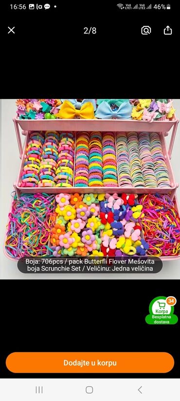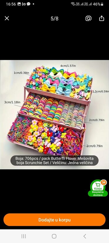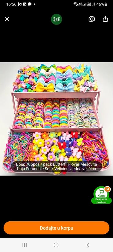 Obiman set dodataka za kosu koji sadrži 706 raznovrsnih komada. Uključuje 300 šarenih elastičnih gumica, 300 scrunchie gumica, 20 elastičnih traka, 20 malih gumica sa motivima, 10 ukosnica sa mašnama, 10 ukosnica u obliku cveća, 10 ukosnica sa leptirima i 6 velikih mašni. Pogodno za kreiranje različitih frizura i stilova, idealno za svakodnevnu upotrebu ili posebne prilike. Kompaktnog dizajna za lako skladištenje i organizaciju.