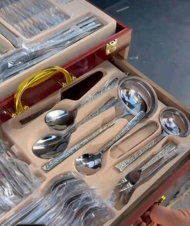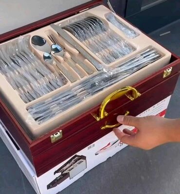Elegantan set escajga, smešten u drvenu kutiju, idealan za svečane prilike ili svakodnevnu upotrebu. Komplet sadrži raznovrsne elemente escajga, uključujući viljuške, noževe, kašike i specijalizovane delove poput kutlače i manjih kašika za serviranje. Drvena kutija sa zlatnim ručkama i kopčama omogućava sigurno skladištenje i lako prenošenje. Svaki komad escajga ima ukrasne detalje na dršci, pružajući sofisticiran izgled. Izrađen od sjajnog metala, ovaj set je praktičan i estetski privlačan dodatak svakom trpezarijskom stolu. Kutija je dizajnirana sa pregradama koje osiguravaju da svaki komad ostane na svom mestu. Ovaj set je savršen za upotpunjavanje vaše kuhinje ili kao vredan poklon.
