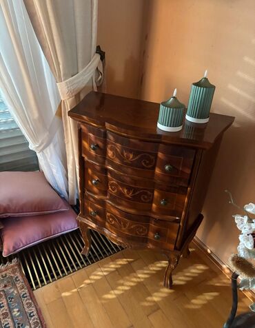 Antikvetska fotelja u klasičnom stilu sa drvenom konstrukcijom i bogato profilisanim naslonima i nogama. Tapacirana je žakard tkaninom u prugama boje bordo i zlatne, sa diskretnim floralnim motivim...