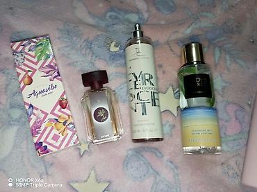 Sve stavke prikazane na fotografijama. Fokus na mirisnim sprejevima i nezi: telo, kosa, lice i usne.