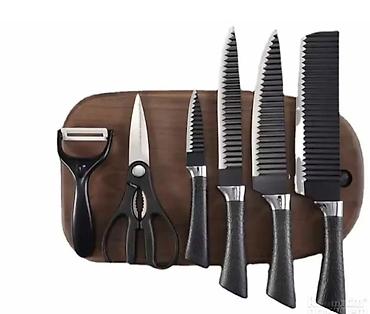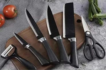 Set uključuje seckalicu, kuvarski nož, nož za hleb, nož za pečenje, makaze i keramičku gulilicu Savršeno za sve vaše potrebe za sečenje, seckanje i rezbarenje