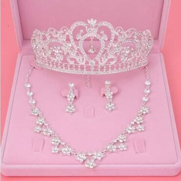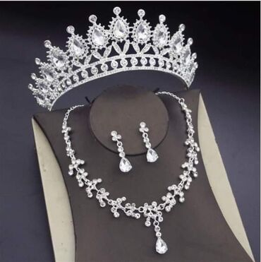 Luksuzni komplet nakita sa krunom – svečani set za posebne prilike Sastav kompleta: - Kruna bogato ukrašena - Ogrlica sa centralnim motivom i visećim suzastim priveskom - Naušnice u obliku kap...