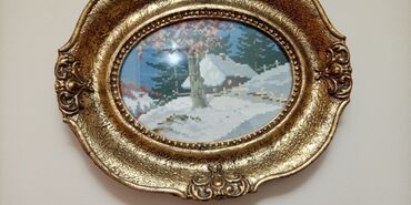 Set ukrasnih zidnih slika – ručni rad gobleni u dekorativnim ovalnim ramovima - Četiri kompozicije pejzaža: zimska idila sa kućicom i snegom; prolećni/brezov drvored sa seoskom kućom; rečni prizor...500 RSD