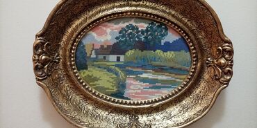 Ručno rađene goblene u bogatim pozlaćenim ramovima Opis: - Set od dva velika goblena, pažljivo izrađena sitnim bodom. - Motiv 1: Pastoralna scena – devojka pored izvora, prirodni pejzaž sa stenama...150 EUR