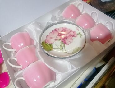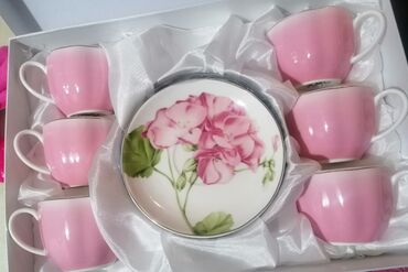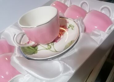 - Dekor: tacnice sa cvetnim motivom (ružičasti cvetovi i zeleni listovi) i diskretnom srebrnom ivicom; šoljice sa tankom srebrnom linijom uz rub.