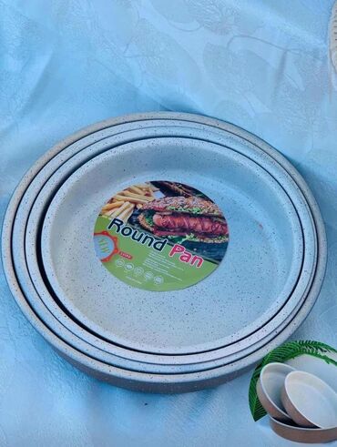 set okruglih posuda za pečenje sa granitnim premazom, poznatijih kao tepsije ili plehovi.