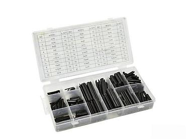 Set opruga–zabrtvnih klinova (spring pin/roll pin) u plastičnoj kutiji sa pregradama.