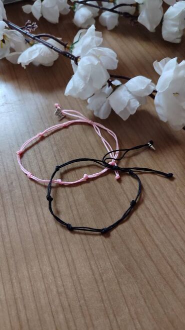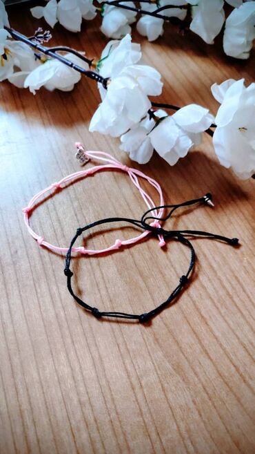 - Detalji: diskretni dekorativni čvorići duž niza; ružičasta narukvica ima mali metalni privrezak; završeci učvršćeni čvorovima/metalnim kapicama