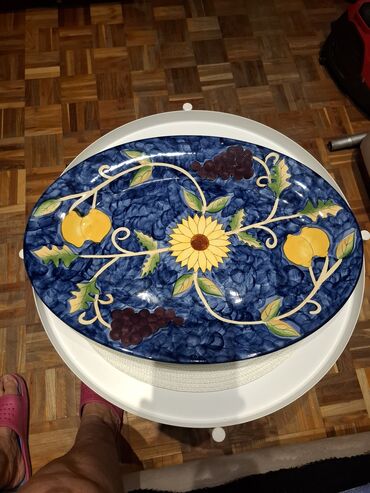 - Uz set dolazi i veliki ovalni keramički tanjir sa ručno oslikanim motivima suncokreta, grožđa i limuna na tamnoplavoj podlozi. Pogodan za serviranje ili kao zidna/stočna dekoracija. Dužina približno veličine poslužavnika (vidljivo na fotografiji).
