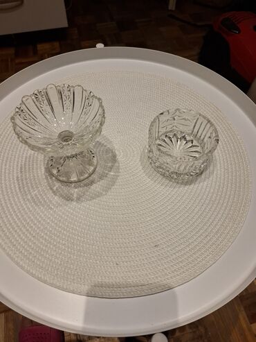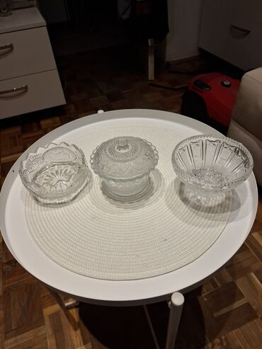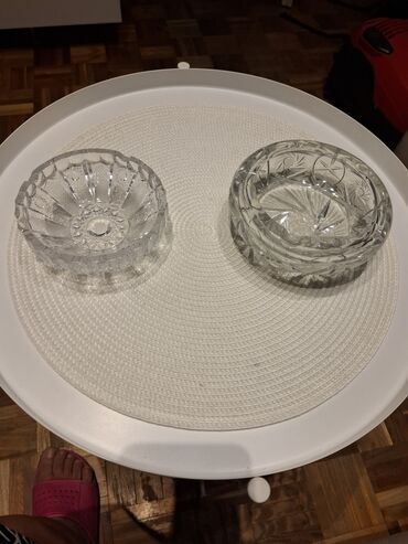- Više komada ukrasnih staklenih činija od teškog, reljefnog stakla (različiti rezbareni motivi: zvezdasti, geometrijski i floralni).