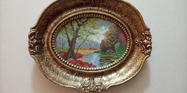 Set od 4 ukrasne zidne slike – ručni rad gobleni u raskošnim ovalnim okvirima. - Motiv 1: prolećni pejzaž pored reke sa drvetom u prvom planu i obalom u toplim tonovima. - Motiv 2: kućica kraj vod...