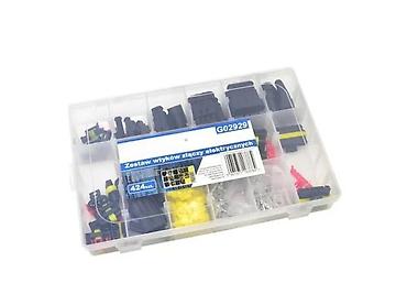 Napomena: za montažu preporučene klešte za krimpovanje. Model sa slike obeležen kao G02929; etiketa: „Zestaw wtyków złączy elektrycznych, 424 szt.”