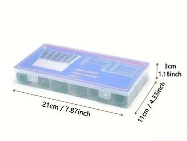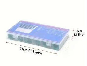 - Kutija: plastični organizer sa 18 pregrada i šarkama; dimenzije kutije približno 21 × 11 × 3 cm, sa kopčom za lako zatvaranje