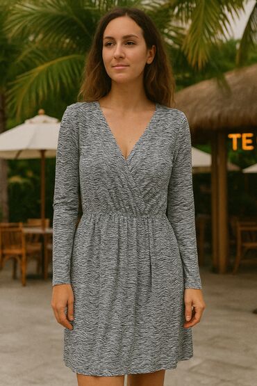 Zenska lagana haljina sa dugim rukavima. V izrez, guma na kraju rukava