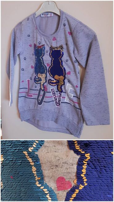 140-146Siva dečija dukserica/džemper od marke Moderin Kids Wear, sa dugim rukavima i okruglim izrezom. Na prednjoj strani je ukras sa dvema mačkama od šljokica koje menjaju boju pri prelazu rukom, uz natpis LOVE i sitne otiske šapa i srca. Donji rub je blago produžen nazad, sa ranflom. Tkanina je meka s unutrašnje strane.