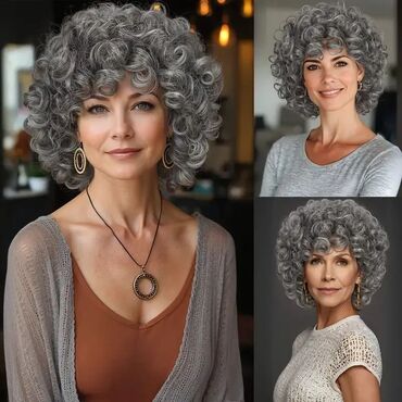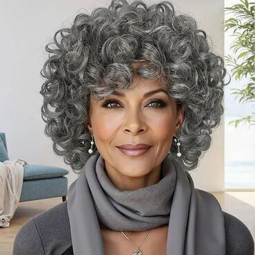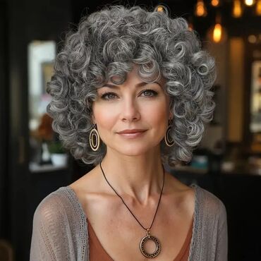 - Stil: gusti, elastični pramenovi sa prirodnim sivo‑srebrnim pramenovima; kratki kovrdžavi bob/afro volumen.