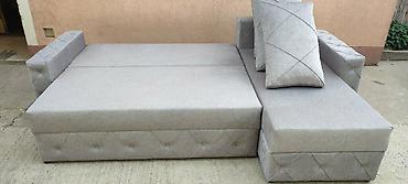 Ugaona garnitura sa ležajem i tabure-otomanskim delom. - Dimenzije: 250 × 160 cm (duža strana x kraća strana) - Sivi štof sa dekorativnim prošivima i geometrijskim šarama - Uključeni jastuci u viš...