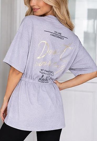 Napomena: Model se prikazuje u dve interpretacije – kao otvoreni kardigan sa učkurom i kao tunika sa zlatnim printom na leđima – obe u istom svetlosivom tonu sa elastičnim strukom.