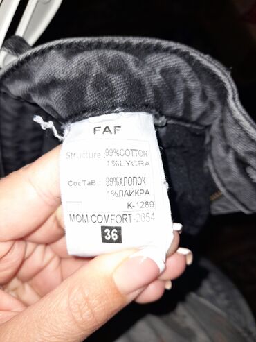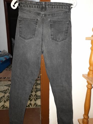 - Kroj: mom fit/comfort, visok struk, uske nogavice prema dole